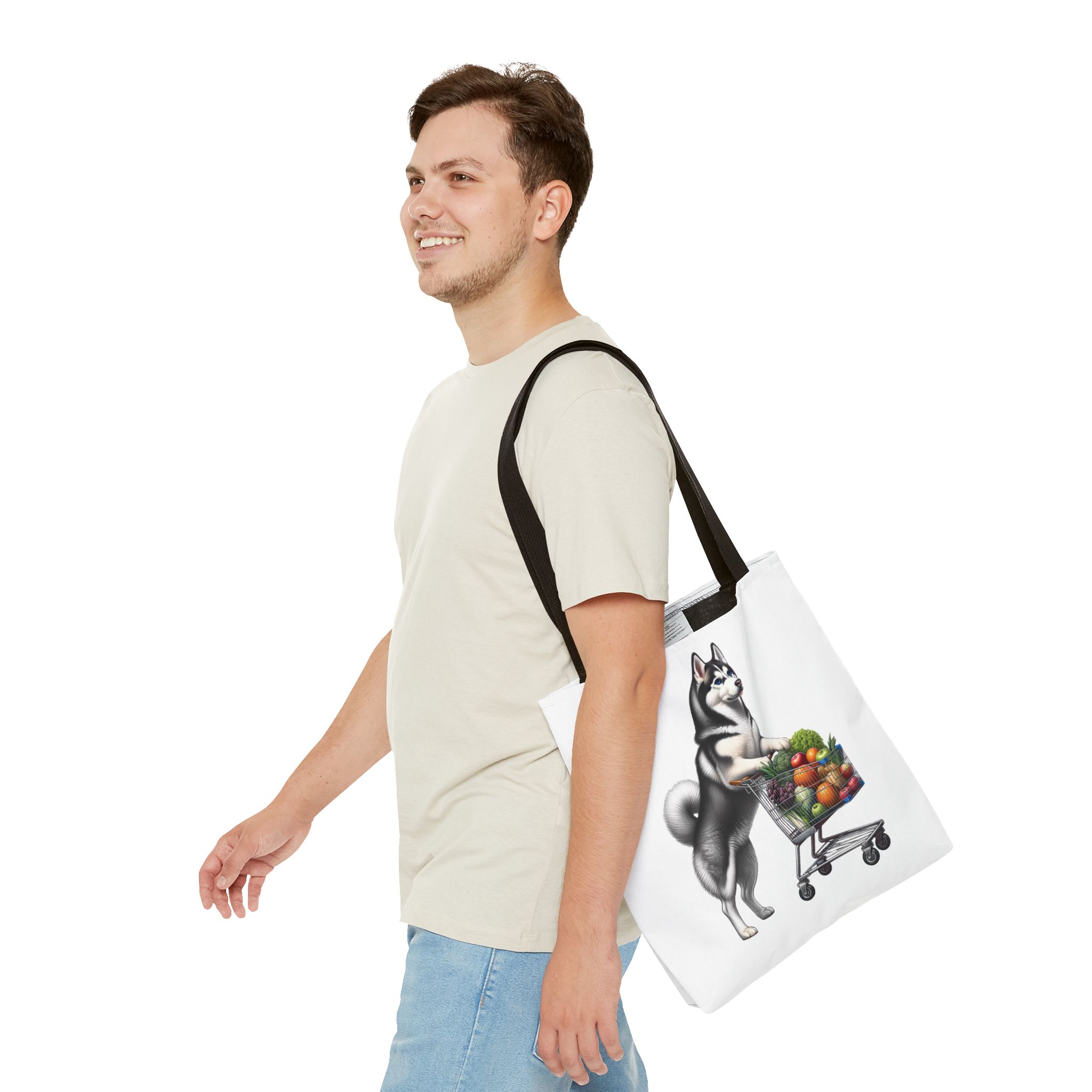 Crafted using dye-sublimation printing, this tote bag boasts high-quality imagery that captures Timber’s playful spirit perfectly. Available in 3 sizes, this bag is designed to add both functionality and style to your shopping trips. With two handle color choices to match your taste, it seamlessly blends with any outfit. Made with spun polyester, the bag features double-stitched seams, cotton webbing straps, and a nonwoven laminate lining for high-end durability. Whethis you’re a Husky lover or simply in need of a reliable and stylish tote, this bag promises to be a delightful and practical addition to your collection, echoing the whimsical charm of Timber’s market adventures.