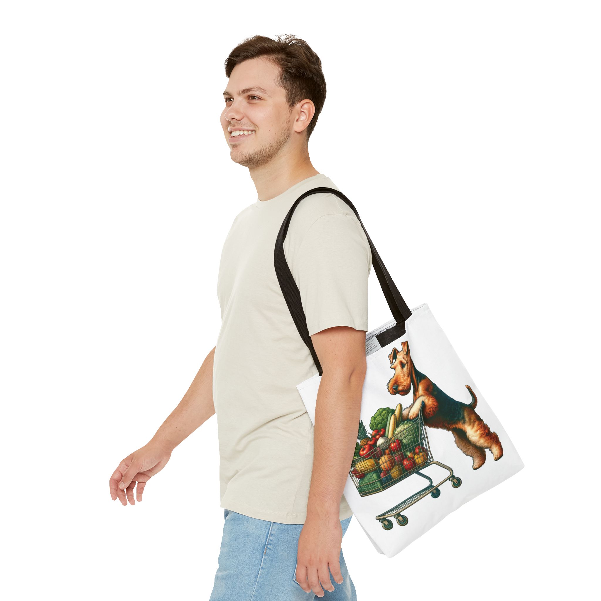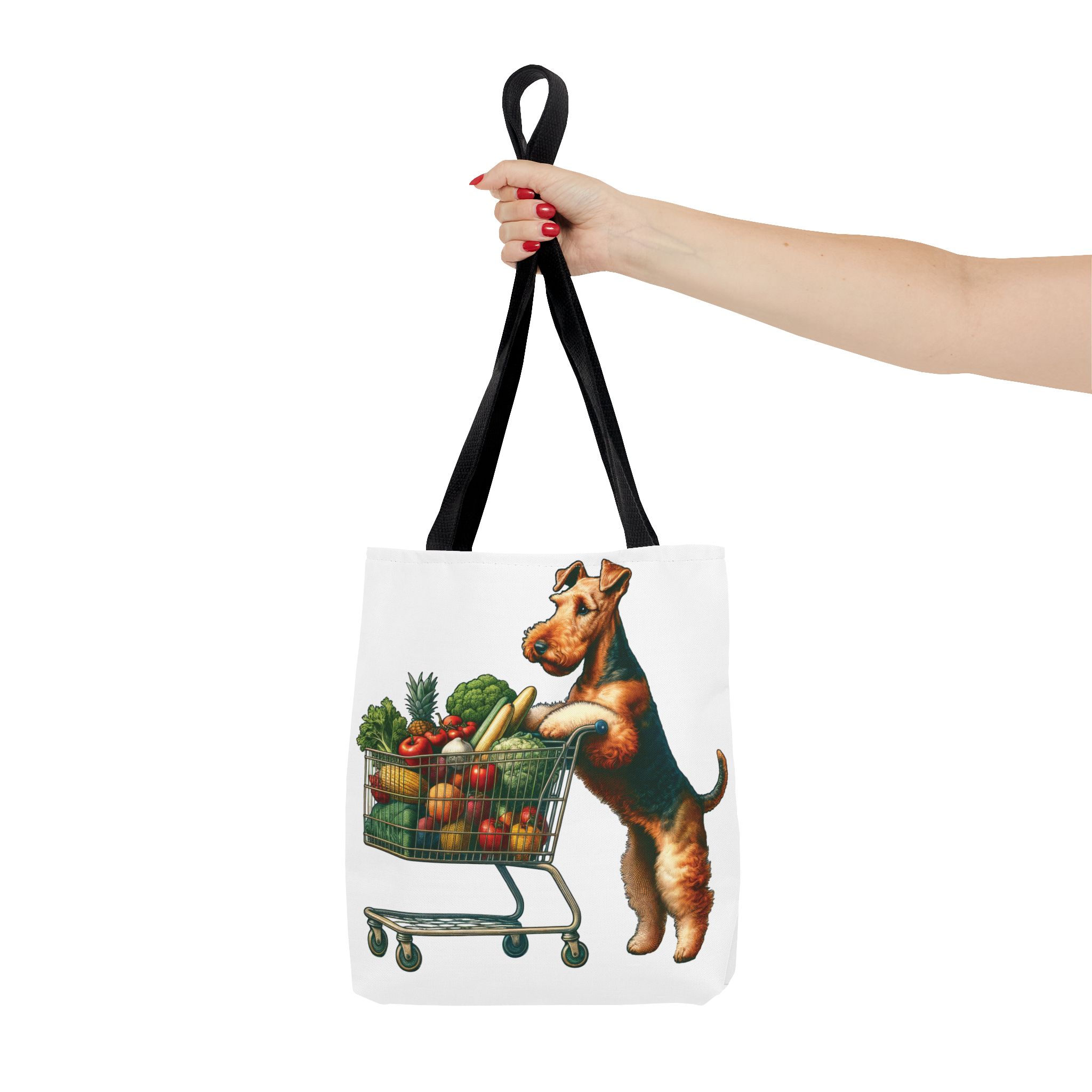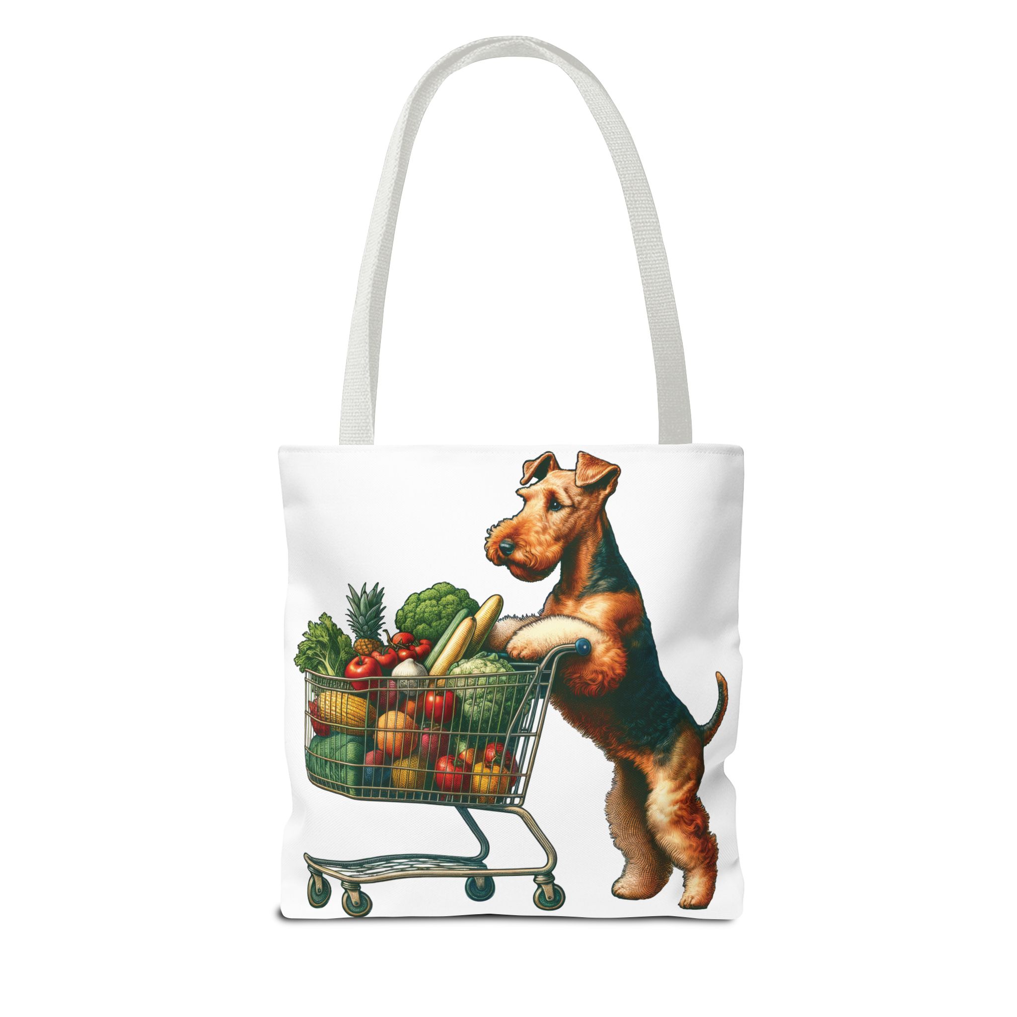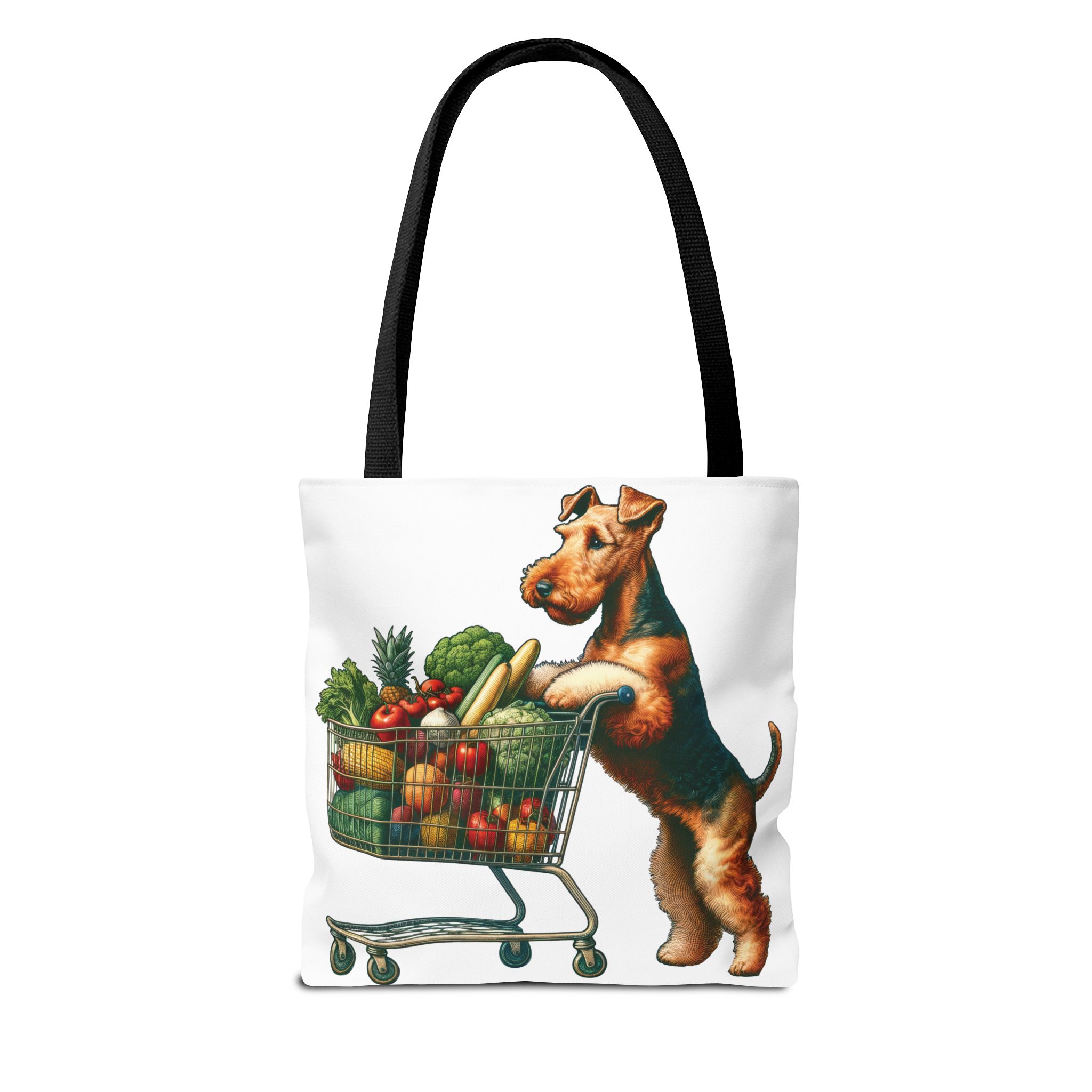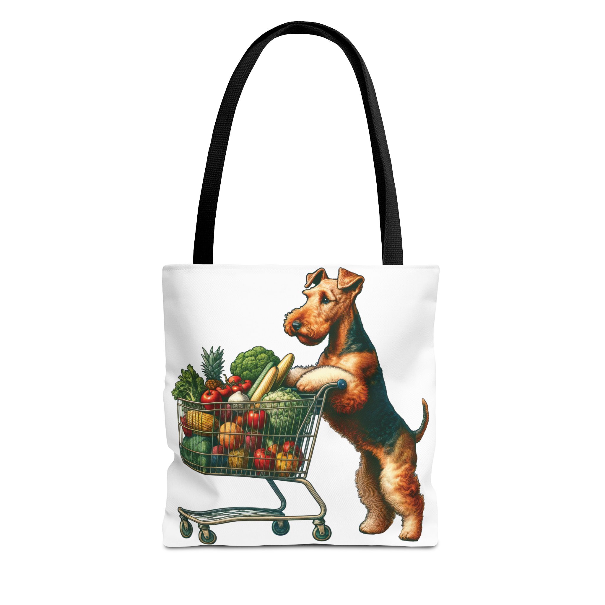 Meet Mango, the delightful Welsh Terrier who loves grocery shopping! Every Saturday morning, Mango takes her miniature shopping cart to the local farmer’s market, where she eagerly fills it with the freshest produce. her bright eyes sparkle with joy as he carefully selects the ripest tomatoes, the crunchiest carrots, and the most fragrant herbs. Mango’s love for healthy living is contagious, and she has become a beloved fixture at the market, always ready with a wagging tail and a friendly bark for her fellow shoppers. This adorable scene is beautifully captured on our tote bag, making it the perfect accessory for any Welsh Terrier lover or health enthusiast.